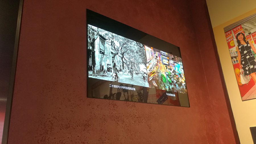 OLED毫米级的屏幕厚度,堪称壁纸屏,哪怕是一面红墙,也能与之搭配得天衣无缝,仿佛它就是嵌在红墙上面的一张会动的壁画,实现完美空间艺术品般的展示效果,给每一位访客带来震撼的视觉体验。