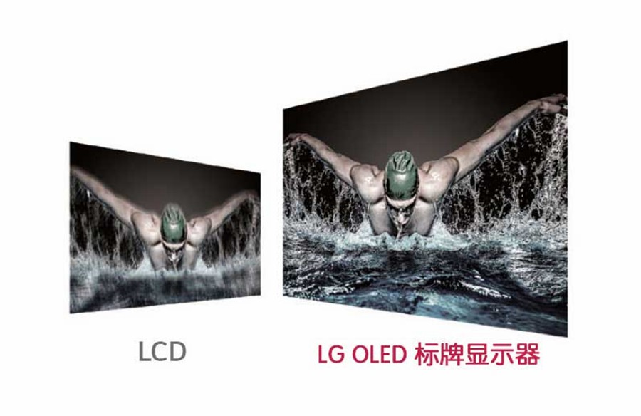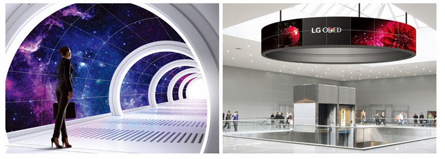 与传统的大屏显示产品相比,OLED无需背光灯,除了包含自身发光特性所带来的轻薄优势,OLED显示技术不但可以让色彩呈现更加自然、色彩层次与对比度表现得更加鲜明,同时其柔性特性也让显示空间整体造型更加的灵活和创新。